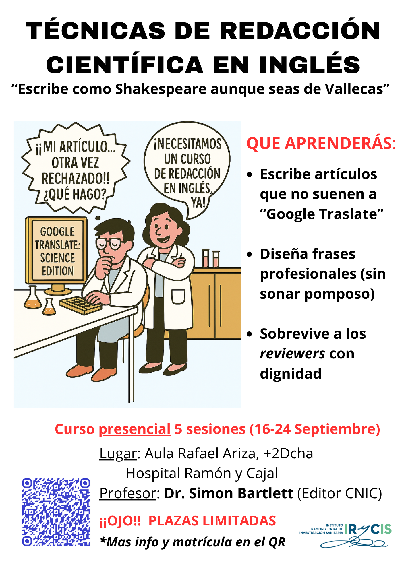 La inscripción final al curso y el envío al profesor de la muestra de redacción científica personal (artículo, "abstract" a congreso, proyecto, etc) debe realizarse antes del 10 de septiembre de 2025.