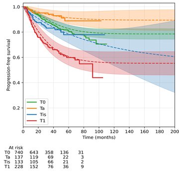Patients and methods: Retrospective multicentre study including patients with primary or secondary T1HG NMIBC treated with TURB, re-TURB, and adequate BCG between 2007 and 2020 across 28 European academic centres. Patients were stratified according to re-TURB pathological stage (T0, Ta, Tis, T1) and EAU21 risk groups. Kaplan-Meier, Cox regression, and competing-risk methods were used to evaluate recurrence-free survival (RFS), HG-RFS, progression-free survival (PFS), and cancer-specific mortality (CSM). A mixture cure model estimated statistical cure fractions for the overall cohort.